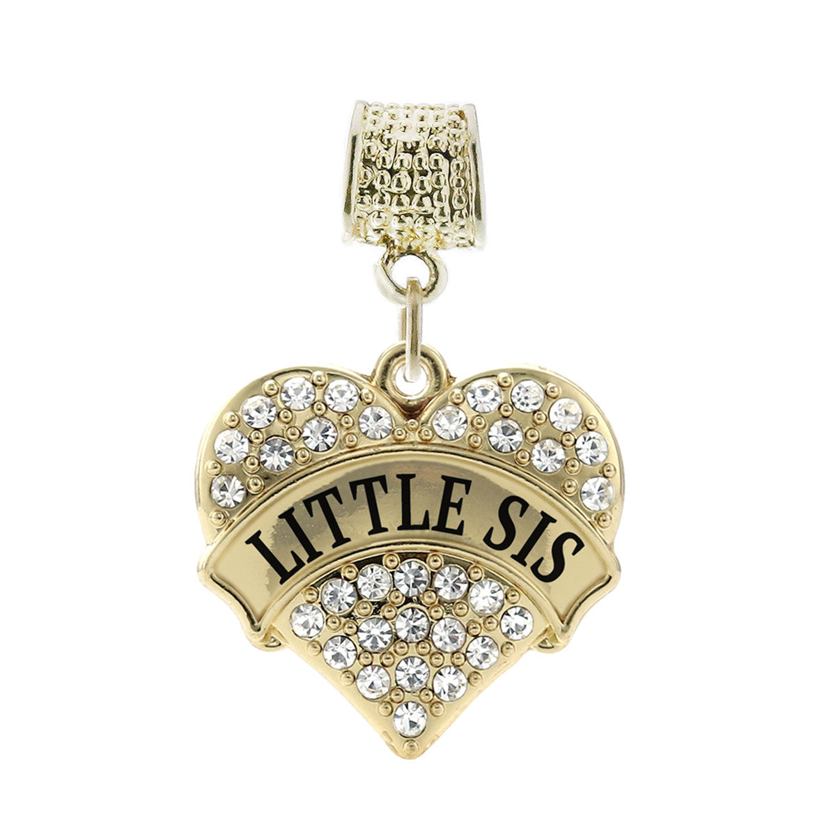 Our sparkling Little Sis jewelry is crafted from white metal topped with a gold plated finish. Each showcased Little Sis pave heart charm is also accented with cubic zirconia stones.