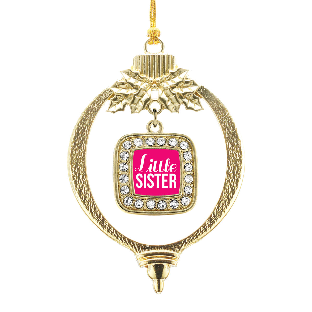 Our sparkling holiday ornament, equipped with a stylish silver rope and the Little Sister square charm, is crafted from white metal with a gold plated finish and accented with cubic zirconia stones.