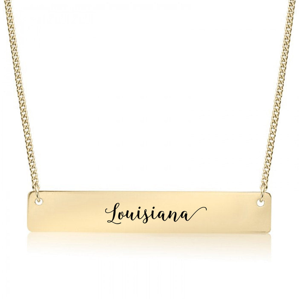 Our sparkling bar necklace, equipped with a stylish lobster claw clasp and the Louisiana bar charm, is crafted from white metal with a gold plated finish.