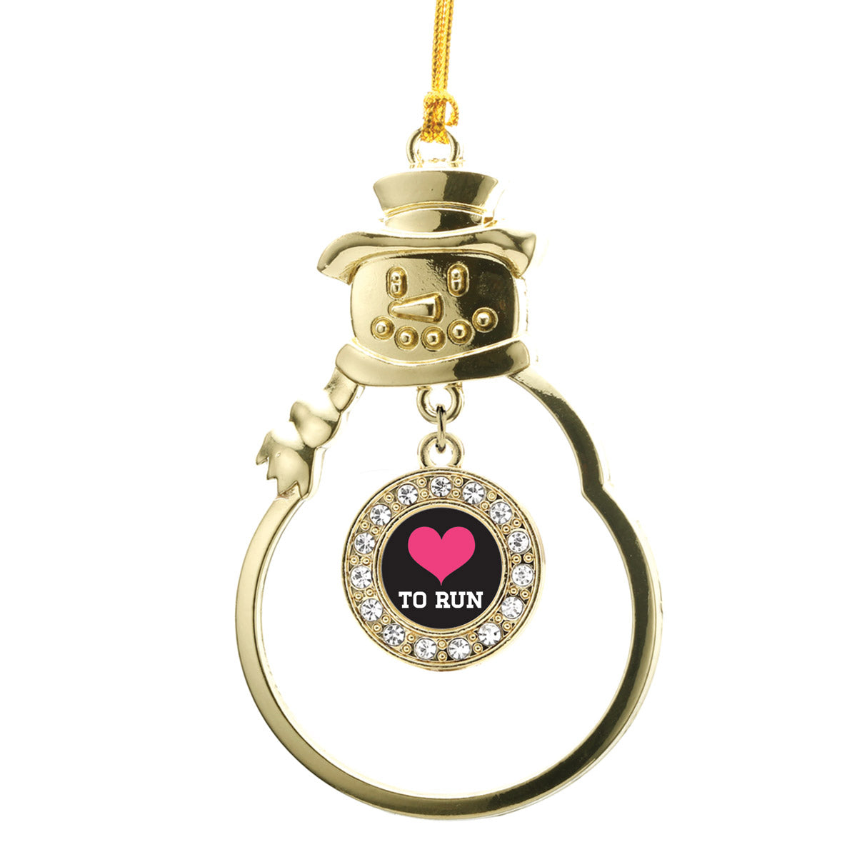 Our sparkling snowman ornament, equipped with a stylish silver rope and the Love To Run circle charm, is crafted from white metal with a gold plated finish and accented with cubic zirconia stones.