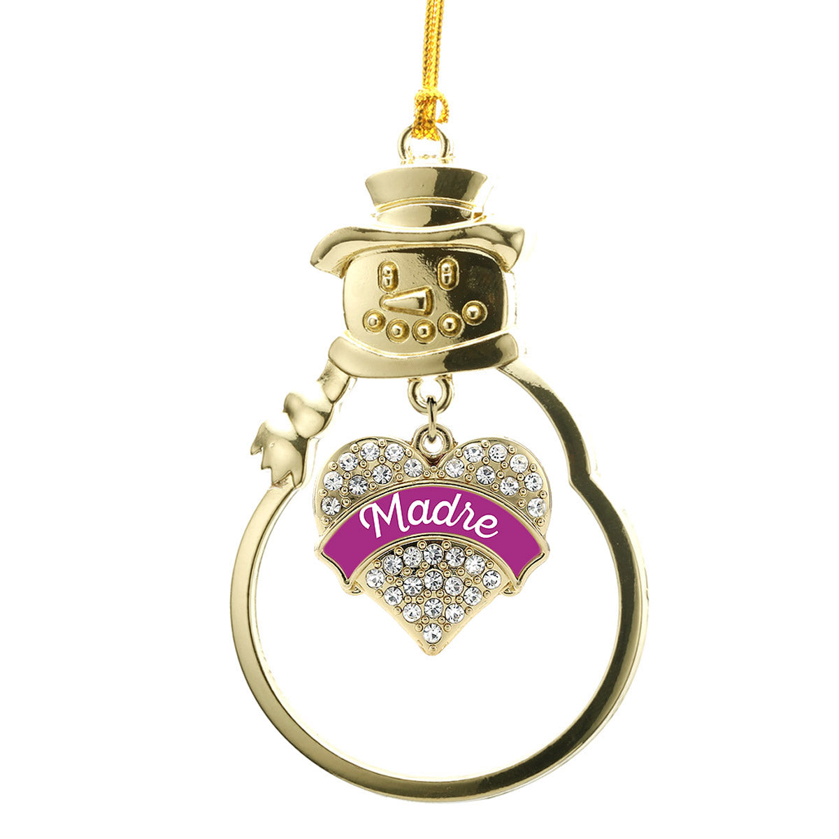 Our sparkling snowman ornament, equipped with a stylish silver rope and the Magenta Madre pave heart charm, is crafted from white metal with a gold plated finish and accented with cubic zirconia stones.