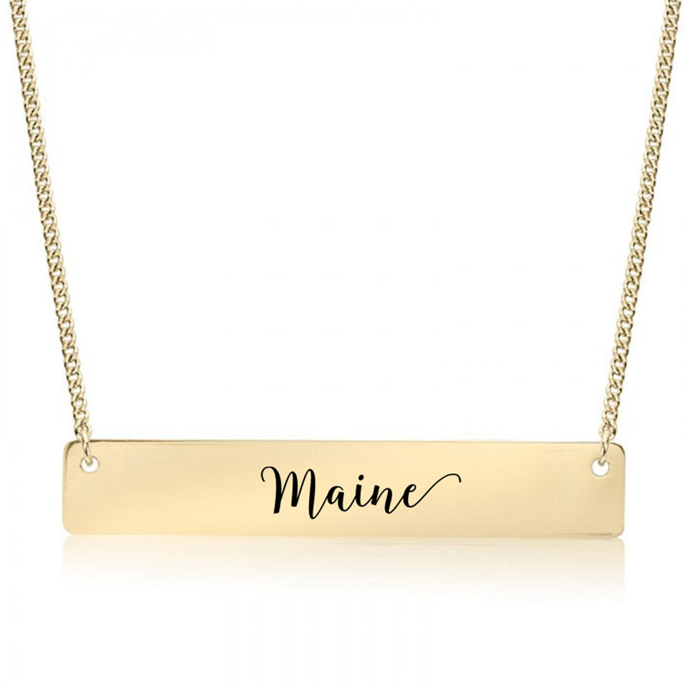 Our sparkling bar necklace, equipped with a stylish lobster claw clasp and the Maine bar charm, is crafted from white metal with a gold plated finish.