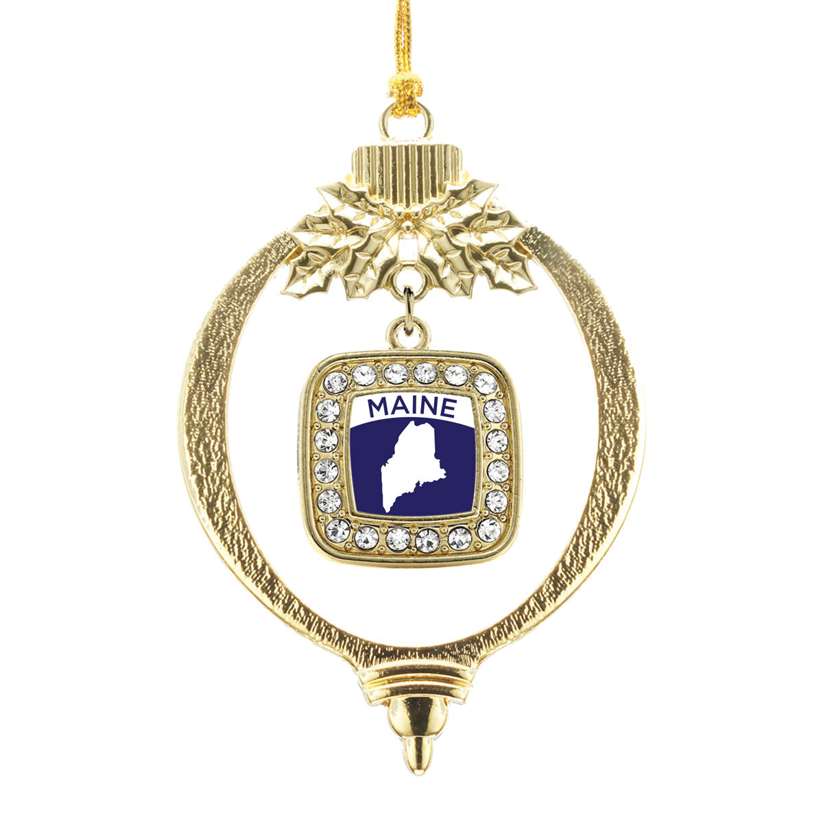 Our sparkling holiday ornament, equipped with a stylish silver rope and the Maine Outline square charm, is crafted from white metal with a gold plated finish and accented with cubic zirconia stones.