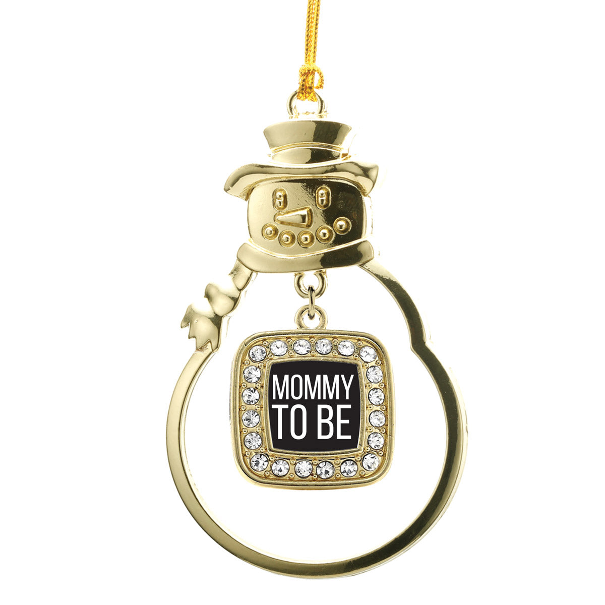 Our sparkling snowman ornament, equipped with a stylish silver rope and the Mommy To Be White square charm, is crafted from white metal with a gold plated finish and accented with cubic zirconia stones.
