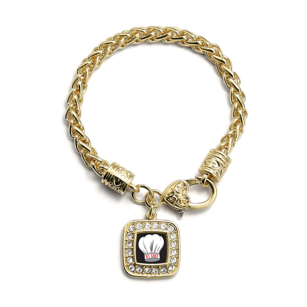Our sparkling braided bracelet, equipped with a stylish lobster claw clasp and the #1 Chef square charm, is crafted from white metal with a gold plated finish and accented with cubic zirconia stones.