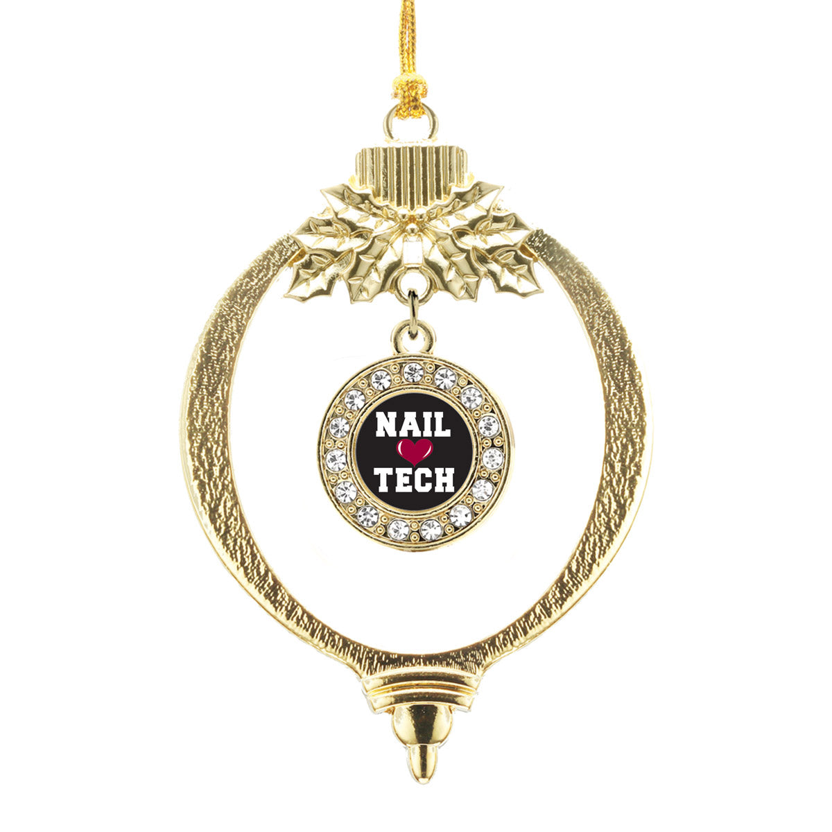 Our sparkling holiday ornament, equipped with a stylish silver rope and the Nail Tech circle charm, is crafted from white metal with a gold plated finish and accented with cubic zirconia stones.