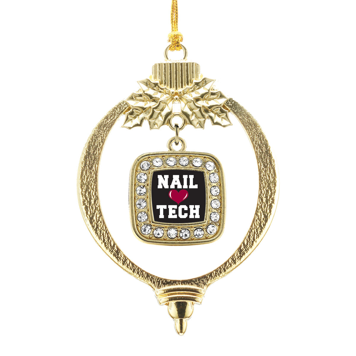 Our sparkling holiday ornament, equipped with a stylish silver rope and the Nail Tech square charm, is crafted from white metal with a gold plated finish and accented with cubic zirconia stones.