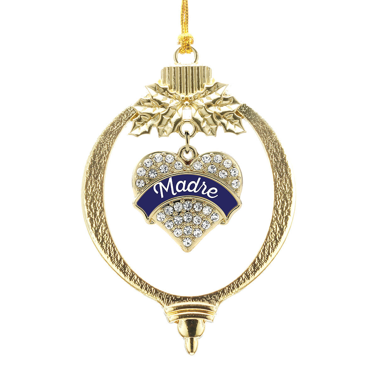Our sparkling holiday ornament, equipped with a stylish silver rope and the Navy Blue Madre pave heart charm, is crafted from white metal with a gold plated finish and accented with cubic zirconia stones.