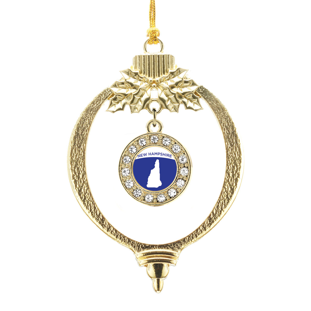 Our sparkling holiday ornament, equipped with a stylish silver rope and the New Hampshire Outline circle charm, is crafted from white metal with a gold plated finish and accented with cubic zirconia stones.