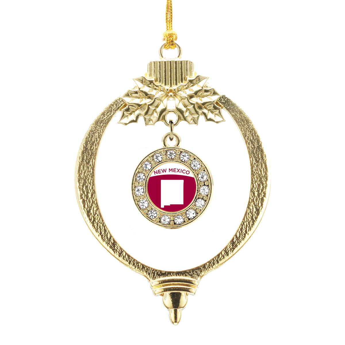 Our sparkling holiday ornament, equipped with a stylish silver rope and the New Mexico Outline circle charm, is crafted from white metal with a gold plated finish and accented with cubic zirconia stones.