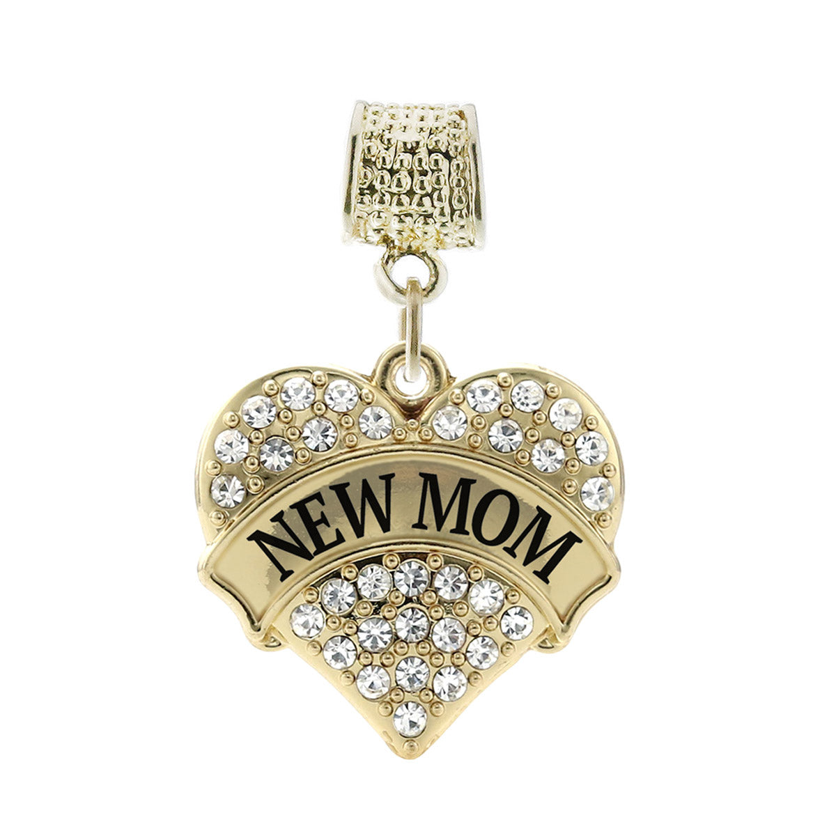 Our sparkling memory charm, equipped with a stylish charm attachment ring and the New Mom pave heart charm, is crafted from white metal with a gold plated finish and accented with cubic zirconia stones.