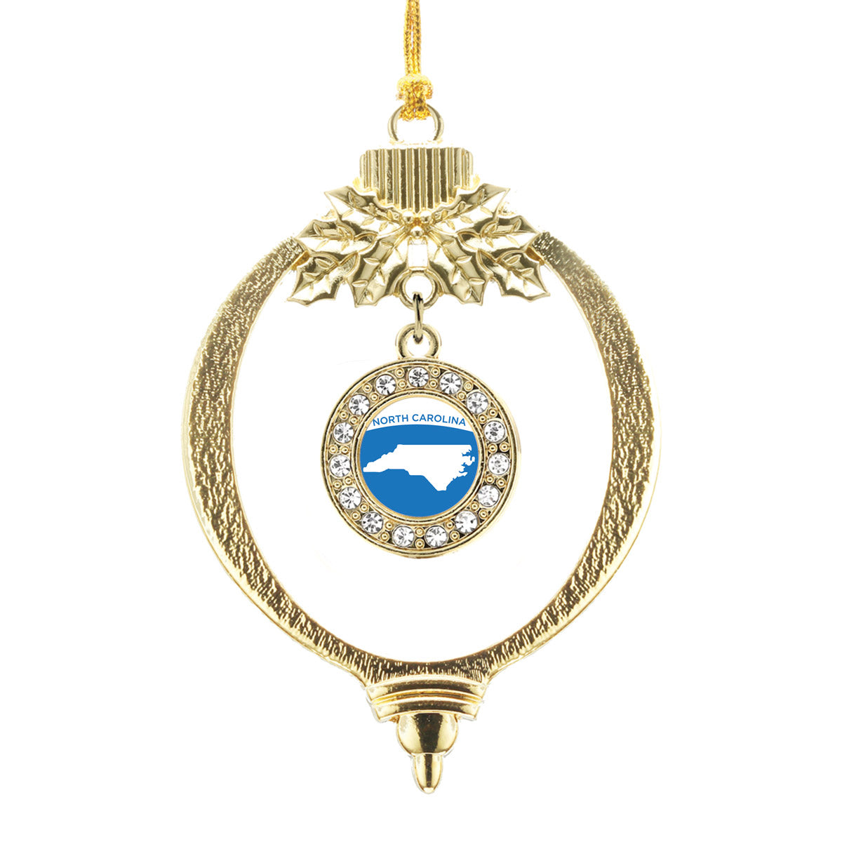 Our sparkling holiday ornament, equipped with a stylish silver rope and the North Carolina Outline circle charm, is crafted from white metal with a gold plated finish and accented with cubic zirconia stones.