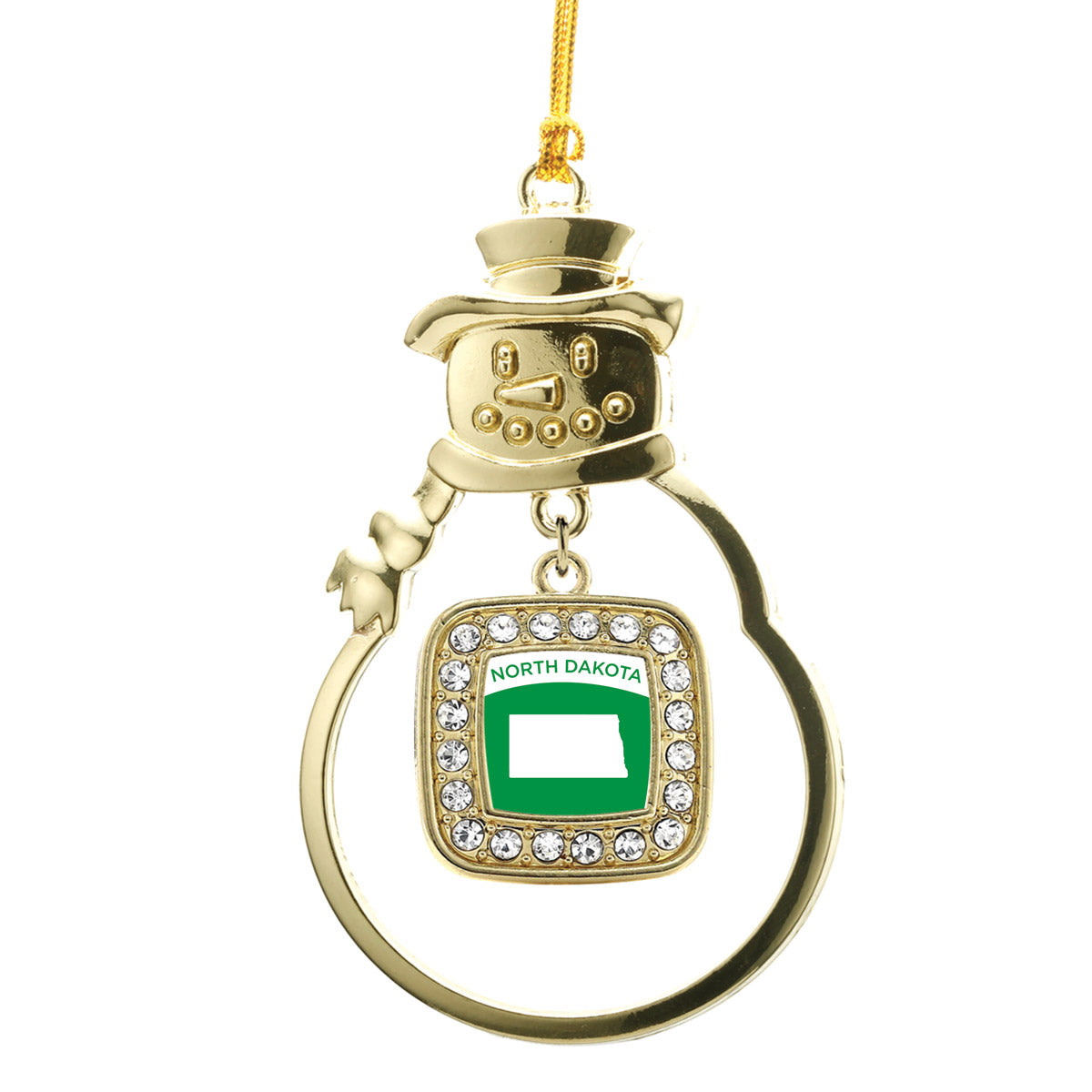 Our sparkling snowman ornament, equipped with a stylish silver rope and the North Dakota Outline square charm, is crafted from white metal with a gold plated finish and accented with cubic zirconia stones.