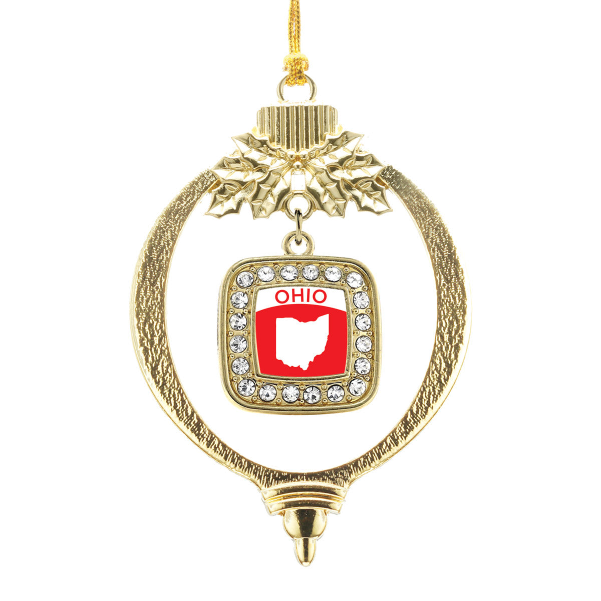 Our sparkling holiday ornament, equipped with a stylish silver rope and the Ohio Outline square charm, is crafted from white metal with a gold plated finish and accented with cubic zirconia stones.