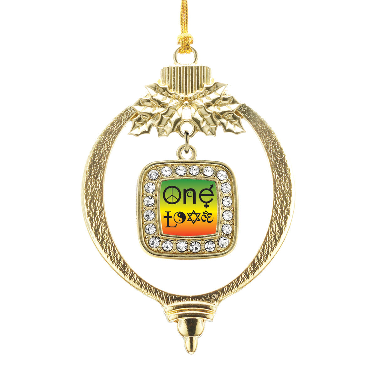 Our sparkling holiday ornament, equipped with a stylish silver rope and the One Love Coexist square charm, is crafted from white metal with a gold plated finish and accented with cubic zirconia stones.