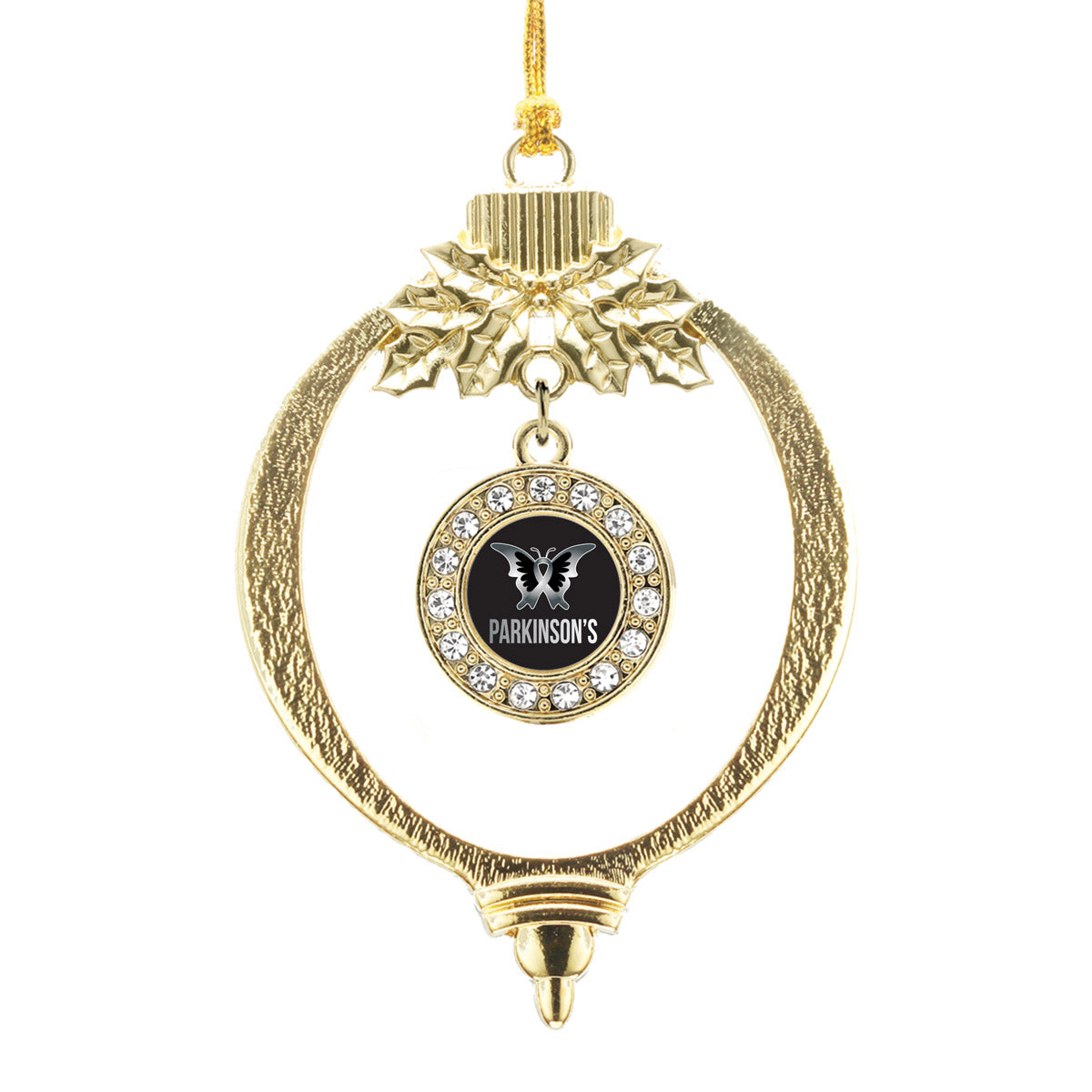Our sparkling holiday ornament, equipped with a stylish silver rope and the Parkinson's Disease Support circle charm, is crafted from white metal with a gold plated finish and accented with cubic zirconia stones.
