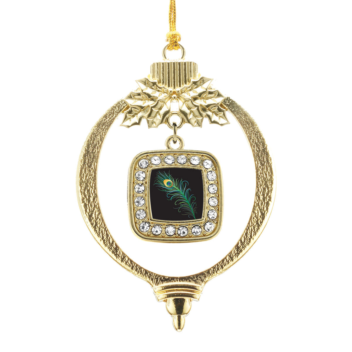 Our sparkling holiday ornament, equipped with a stylish silver rope and the Peacock Feather square charm, is crafted from white metal with a gold plated finish and accented with cubic zirconia stones.