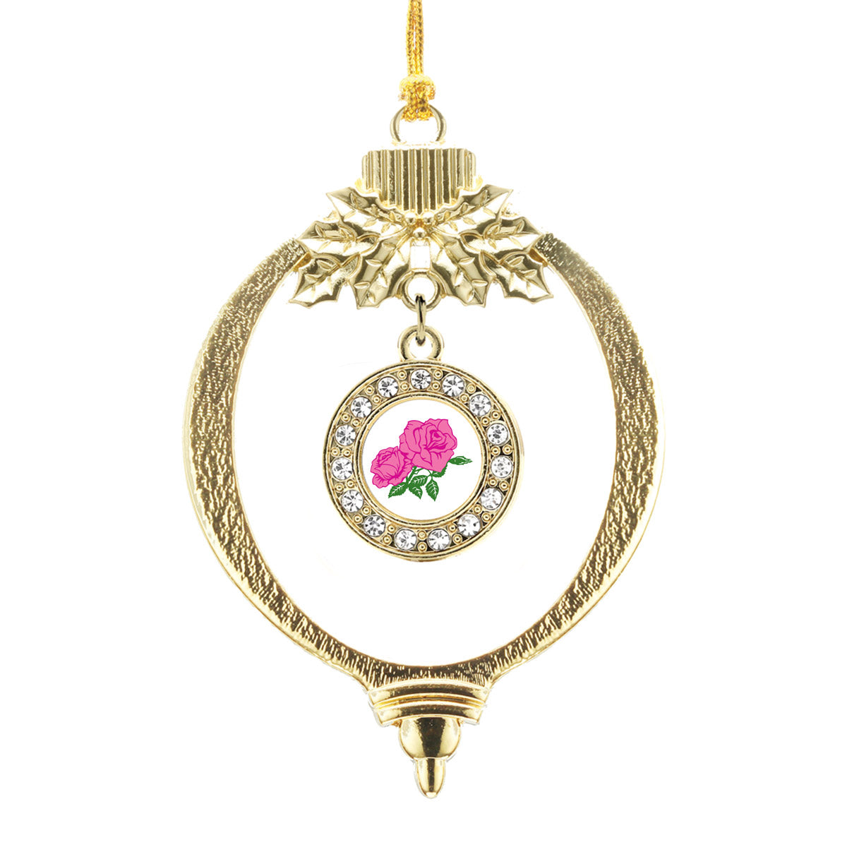 Our sparkling holiday ornament, equipped with a stylish silver rope and the Pink Rose circle charm, is crafted from white metal with a gold plated finish and accented with cubic zirconia stones.
