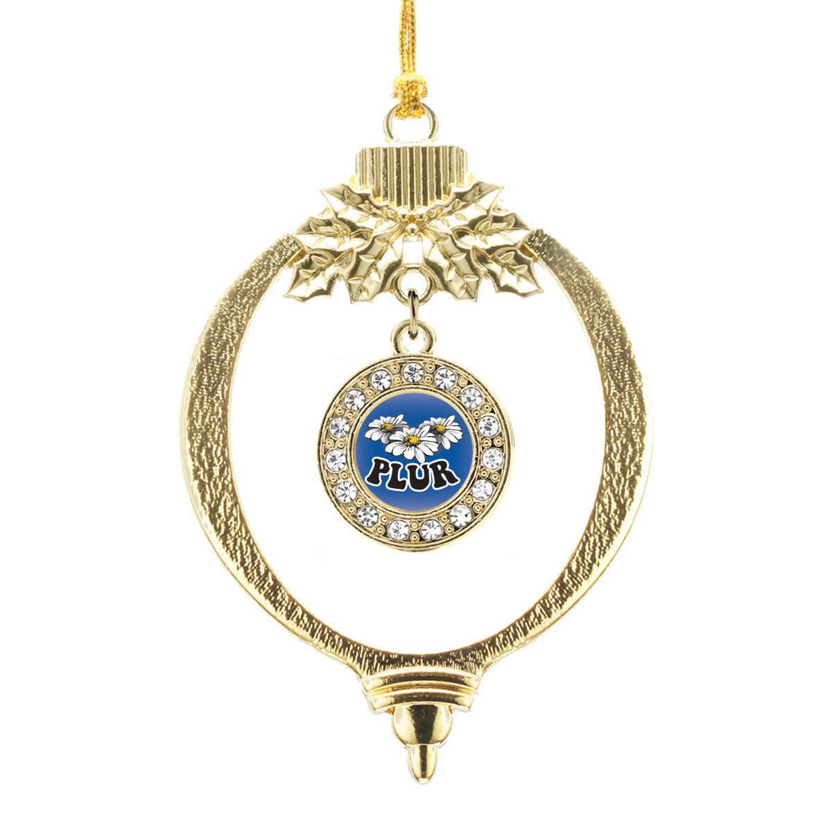 Our sparkling holiday ornament, equipped with a stylish silver rope and the PLUR circle charm, is crafted from white metal with a gold plated finish and accented with cubic zirconia stones.
