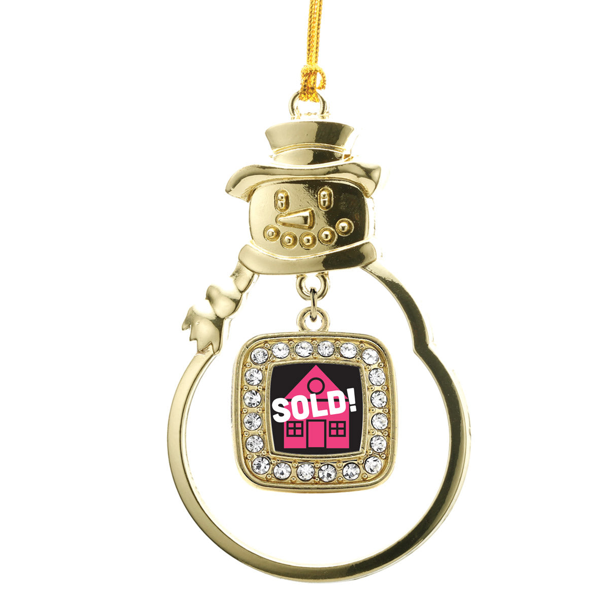Our sparkling snowman ornament, equipped with a stylish silver rope and the Real Estate Agent square charm, is crafted from white metal with a gold plated finish and accented with cubic zirconia stones.