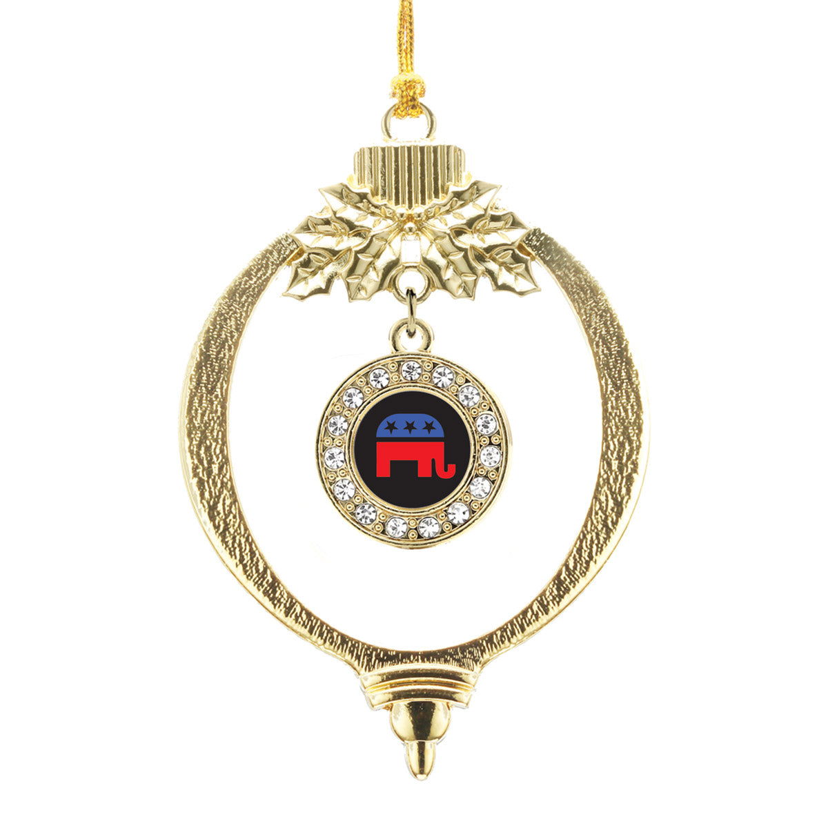 Our sparkling holiday ornament, equipped with a stylish silver rope and the Republican circle charm, is crafted from white metal with a gold plated finish and accented with cubic zirconia stones.
