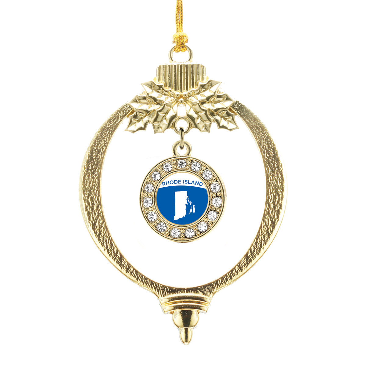 Our sparkling holiday ornament, equipped with a stylish silver rope and the Rhode Island Outline circle charm, is crafted from white metal with a gold plated finish and accented with cubic zirconia stones.