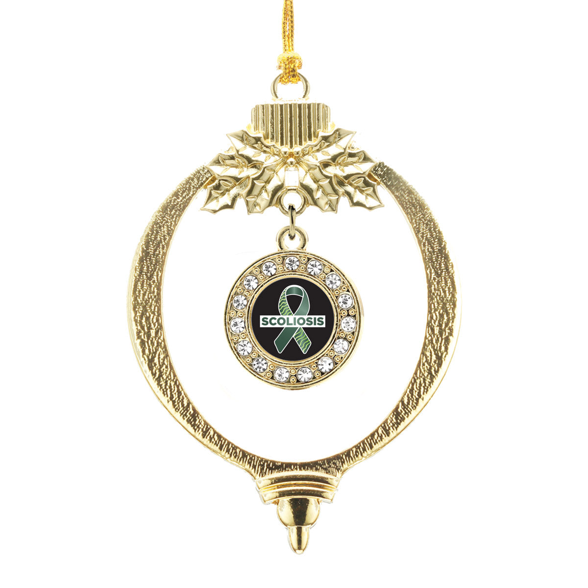 Our sparkling holiday ornament, equipped with a stylish silver rope and the Scoliosis Support and Awareness circle charm, is crafted from white metal with a gold plated finish and accented with cubic zirconia stones.
