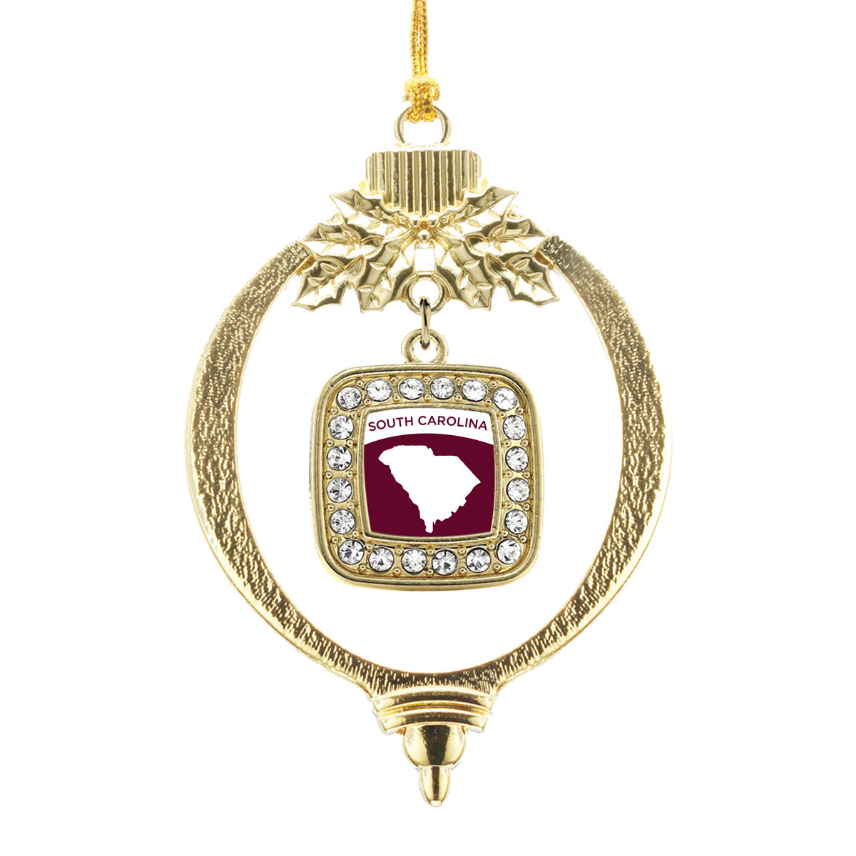 Our sparkling holiday ornament, equipped with a stylish silver rope and the South Carolina Outline square charm, is crafted from white metal with a gold plated finish and accented with cubic zirconia stones.