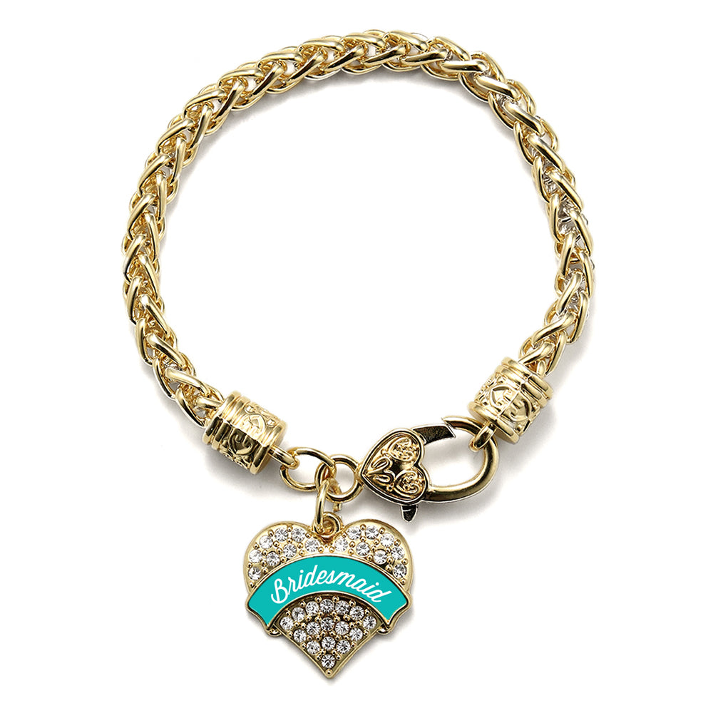 Our sparkling braided bracelet, equipped with a stylish lobster claw clasp and the Teal Bridesmaid pave heart charm, is crafted from white metal with a gold plated finish and accented with cubic zirconia stones.