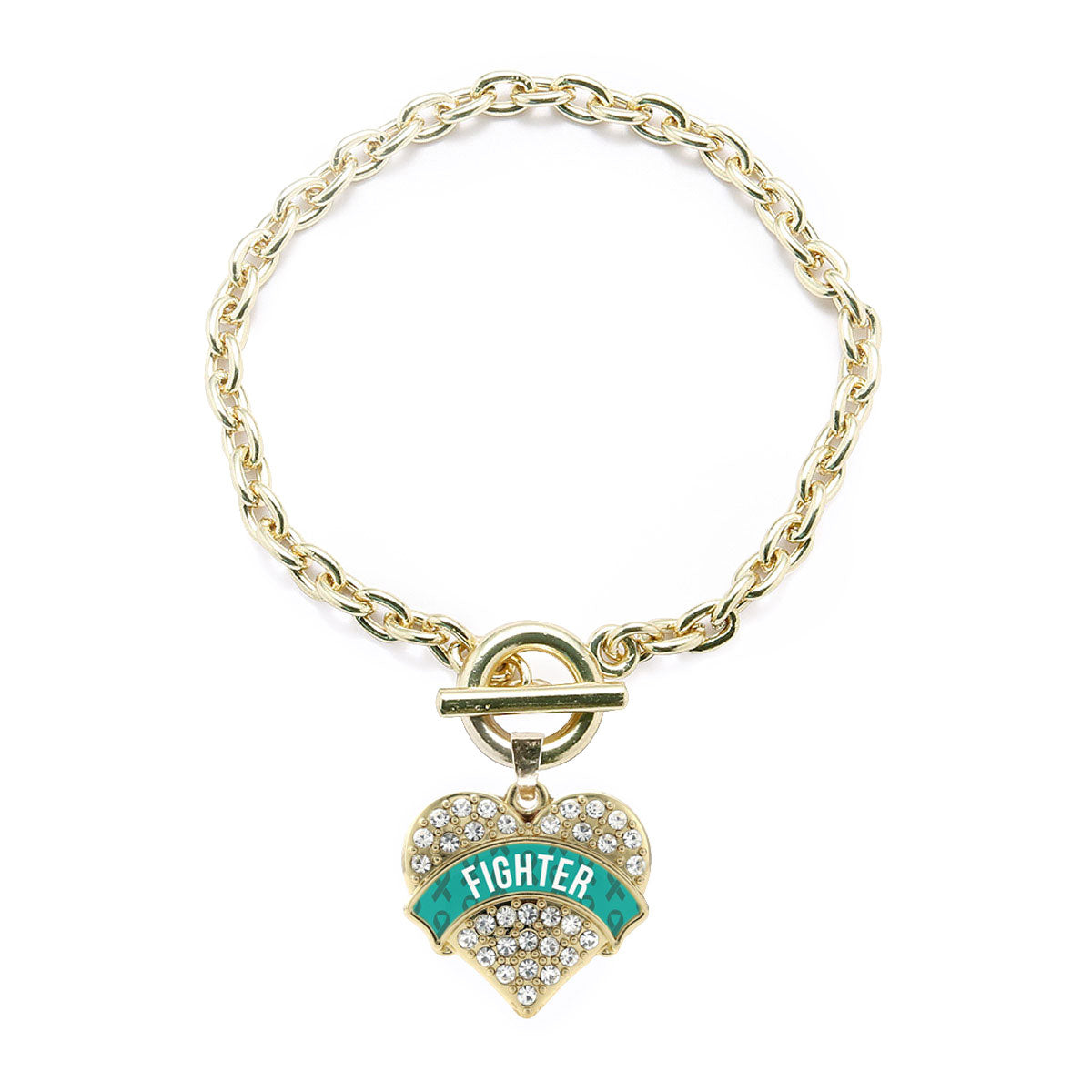Gold Teal Fighter Pave Heart Charm Toggle Bracelet