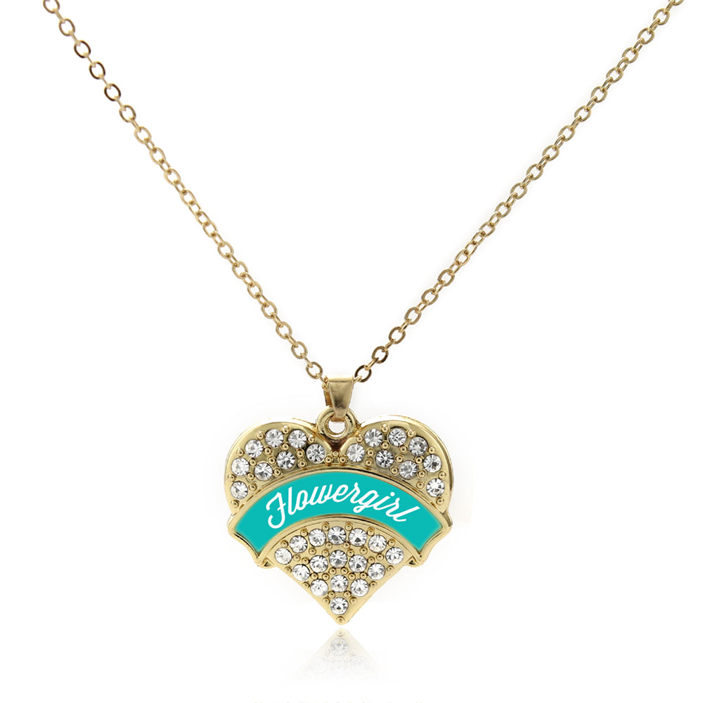 Our sparkling classic necklace, equipped with a stylish lobster claw clasp and the Teal Flower Girl pave heart charm, is crafted from white metal with a gold plated finish and accented with cubic zirconia stones.