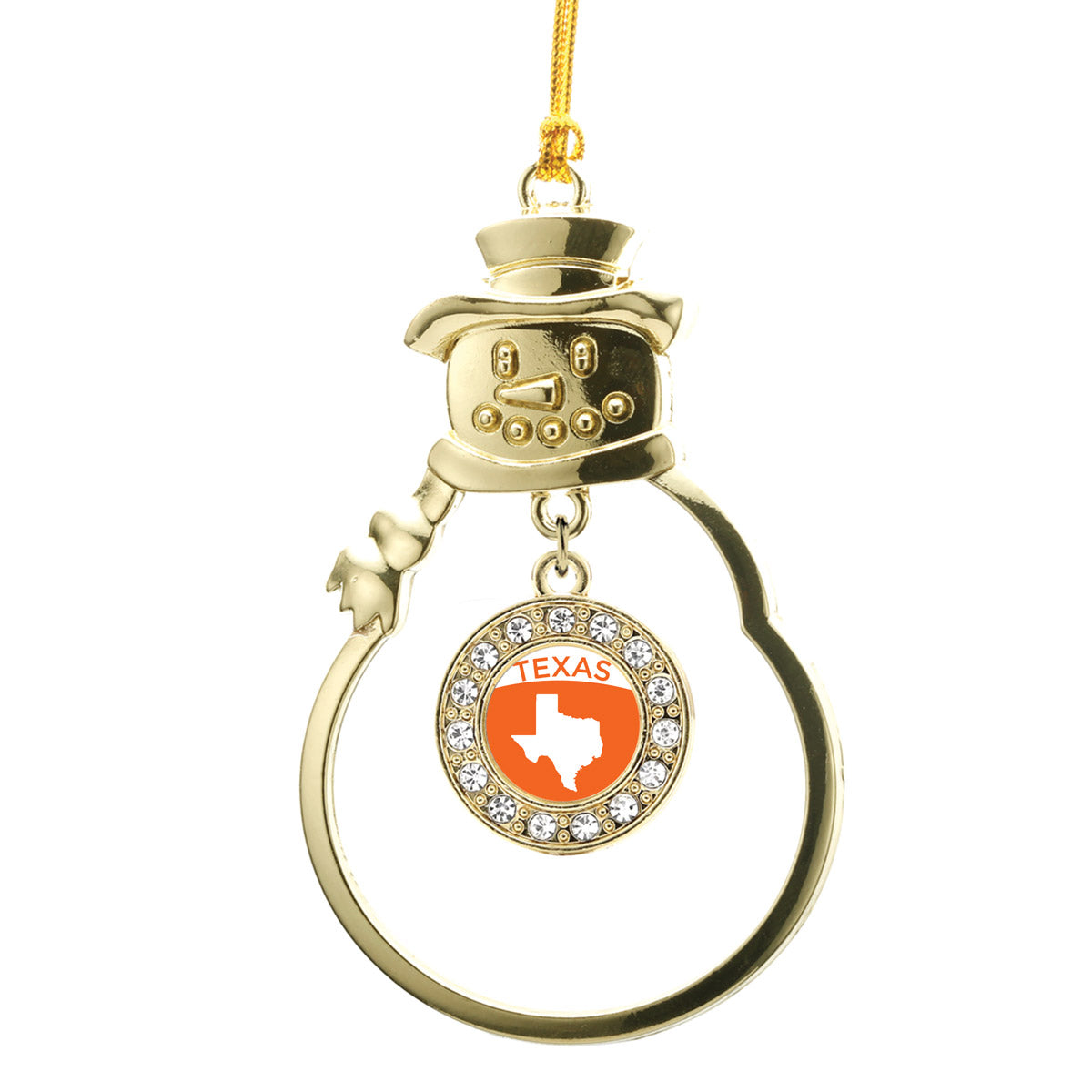 Our sparkling snowman ornament, equipped with a stylish silver rope and the Texas Outline circle charm, is crafted from white metal with a gold plated finish and accented with cubic zirconia stones.