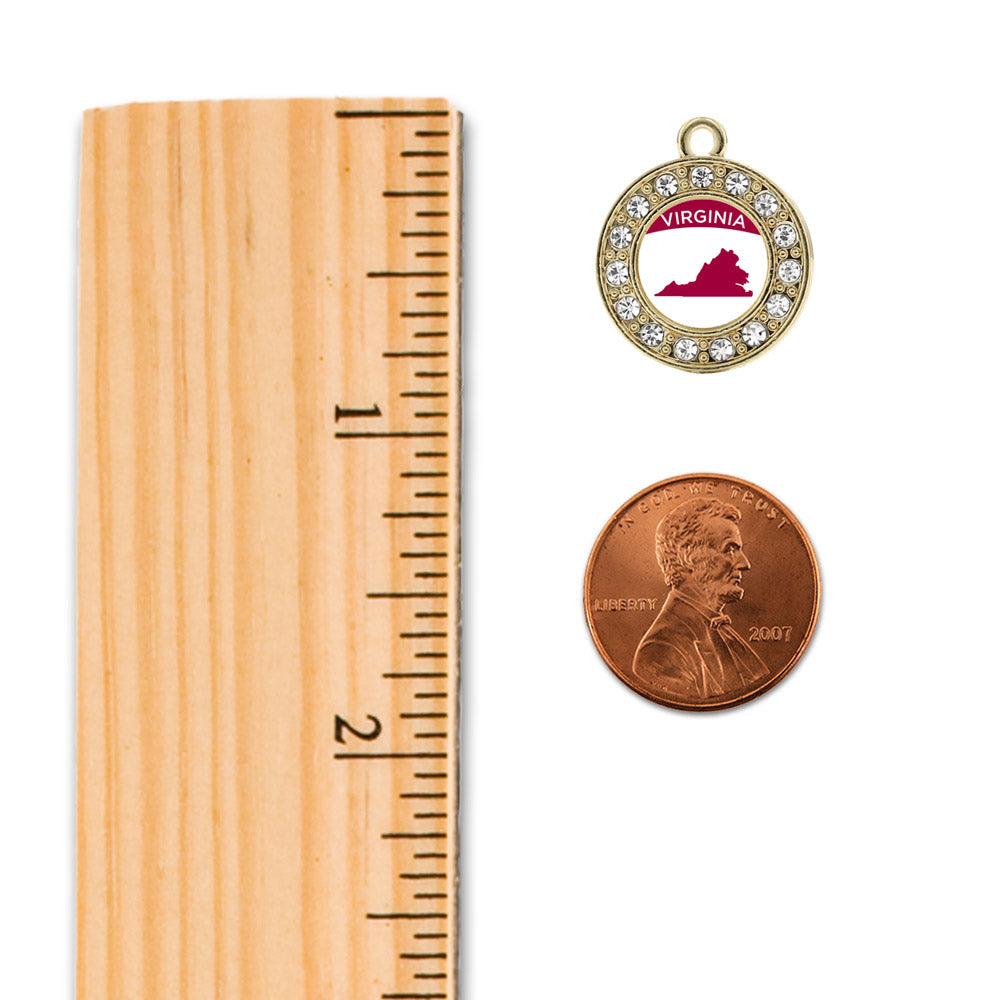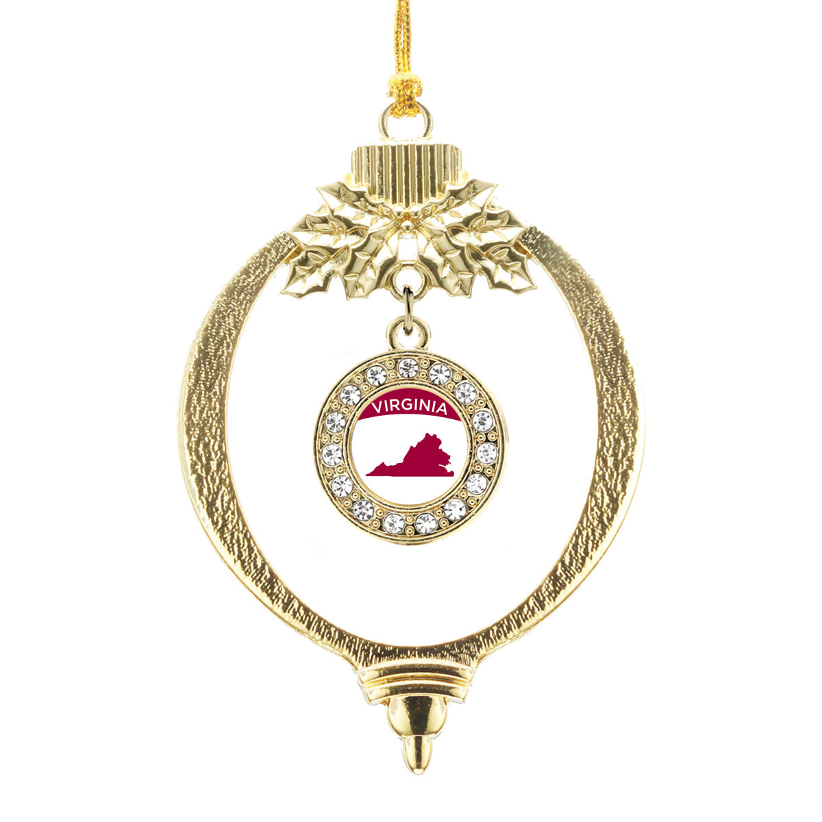 Our sparkling holiday ornament, equipped with a stylish silver rope and the Virginia Outline circle charm, is crafted from white metal with a gold plated finish and accented with cubic zirconia stones.