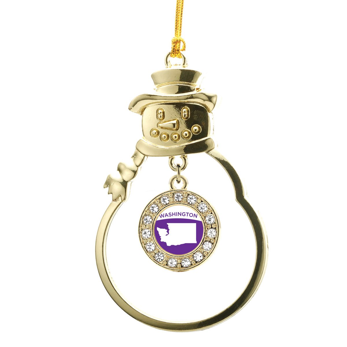 Our sparkling snowman ornament, equipped with a stylish silver rope and the Washington Outline circle charm, is crafted from white metal with a gold plated finish and accented with cubic zirconia stones.