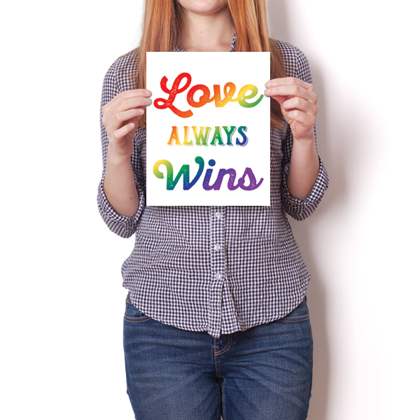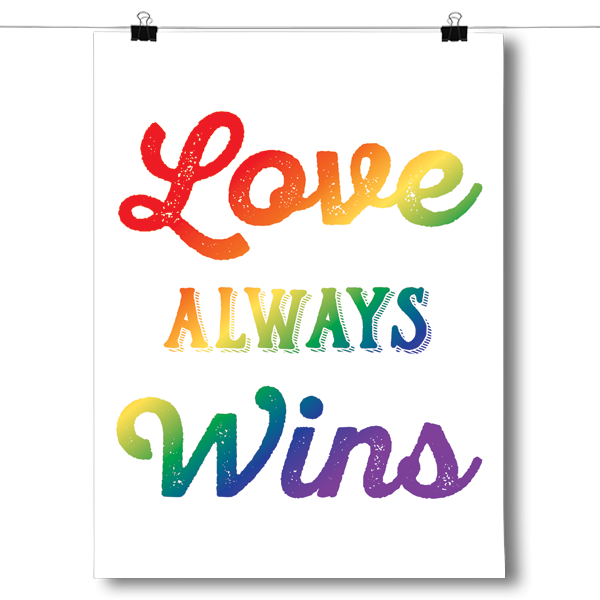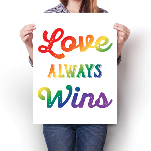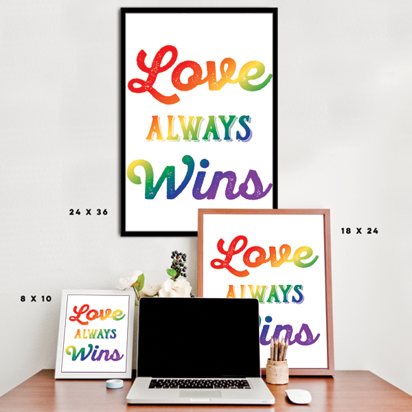 This unique Love Always Wins - LGBT - White poster was creatively designed and printed on thick paper with a high-quality finish in-house using UV Printing process, where the ink is cured by UV rays to produce sharp and vivid images with a high degree of color accuracy.
