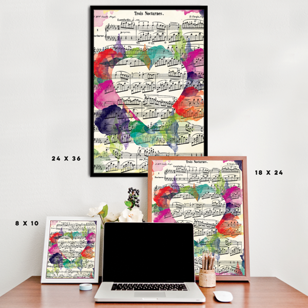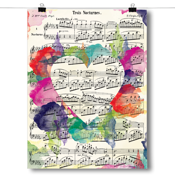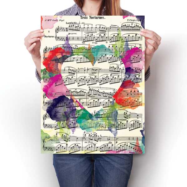 This unique Music Sheet Heart poster was creatively designed and printed on thick paper with a high-quality finish in-house using UV Printing process, where the ink is cured by UV rays to produce sharp and vivid images with a high degree of color accuracy.