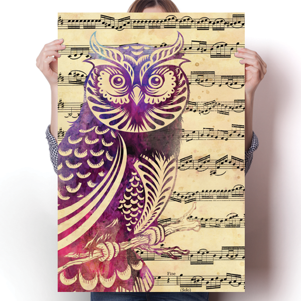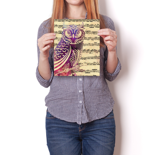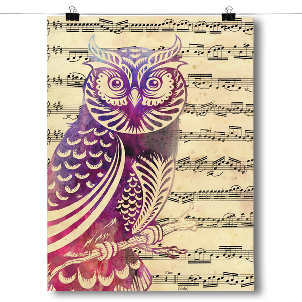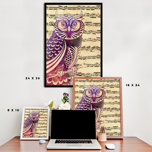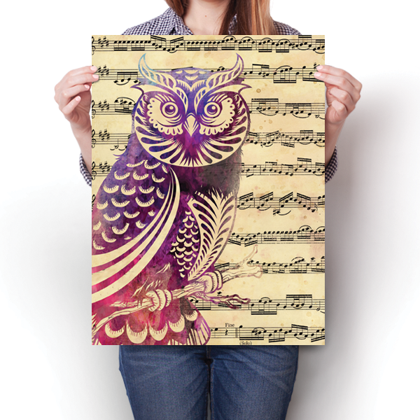 This unique Owl with Music Notes poster was creatively designed and printed on thick paper with a high-quality finish in-house using UV Printing process, where the ink is cured by UV rays to produce sharp and vivid images with a high degree of color accuracy.