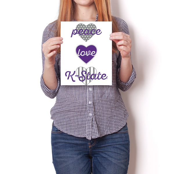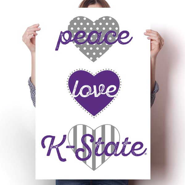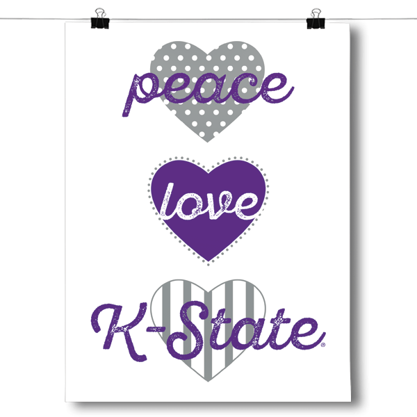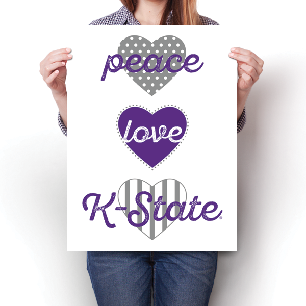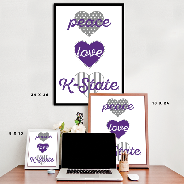 This unique Peace, Love, K-State - NCAA poster was creatively designed and printed on thick paper with a high-quality finish in-house using UV Printing process, where the ink is cured by UV rays to produce sharp and vivid images with a high degree of color accuracy.