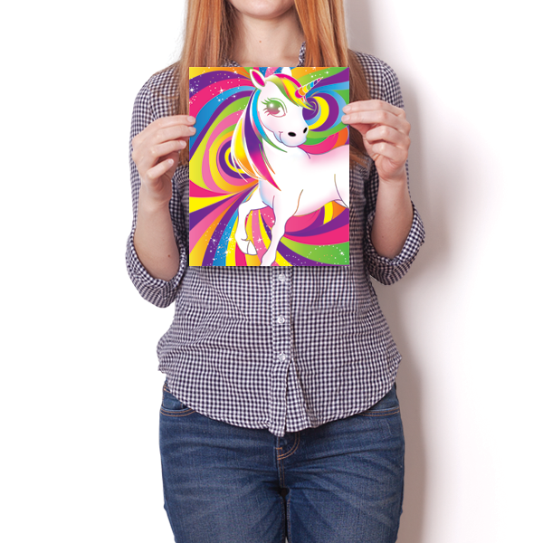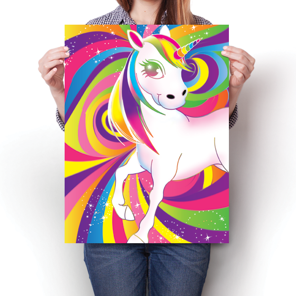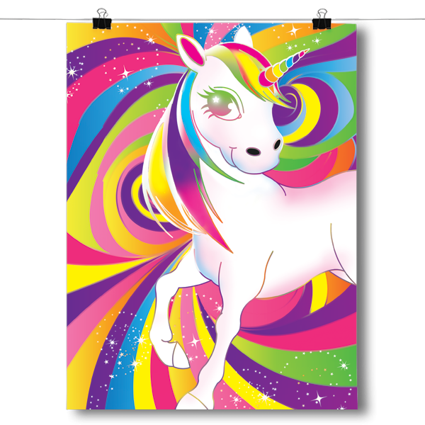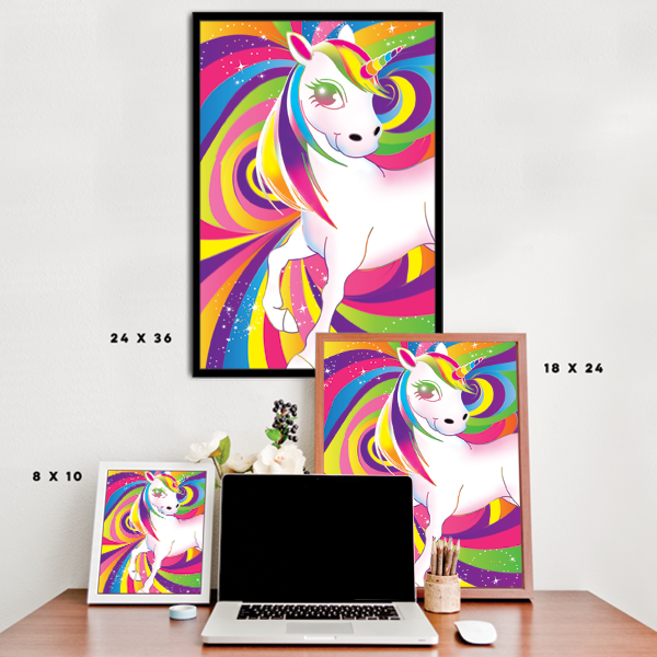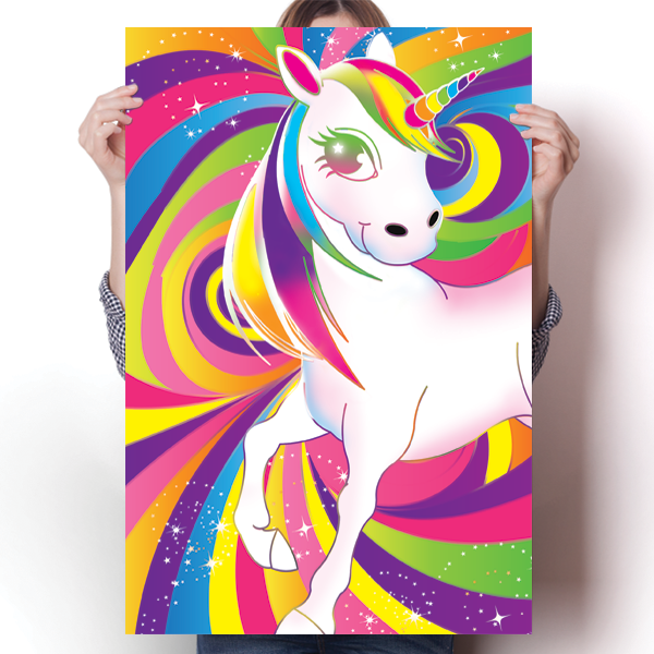This unique Rainbow Unicorn Swirls poster was creatively designed and printed on thick paper with a high-quality finish in-house using UV Printing process, where the ink is cured by UV rays to produce sharp and vivid images with a high degree of color accuracy.