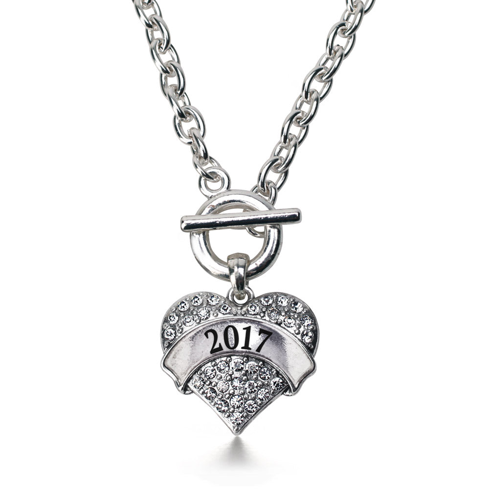 Our sparkling toggle necklace, equipped with a stylish toggle clasp and the 2017 pave heart charm, is crafted from white metal with a silver plated finish and accented with cubic zirconia stones.