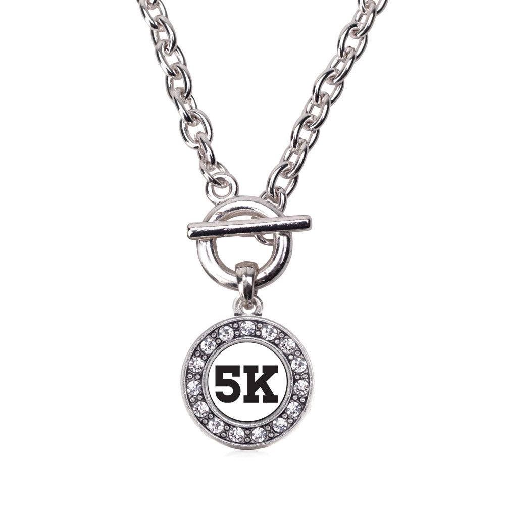 Our sparkling toggle necklace, equipped with a stylish toggle clasp and the 5K Runners circle charm, is crafted from white metal with a silver plated finish and accented with cubic zirconia stones.