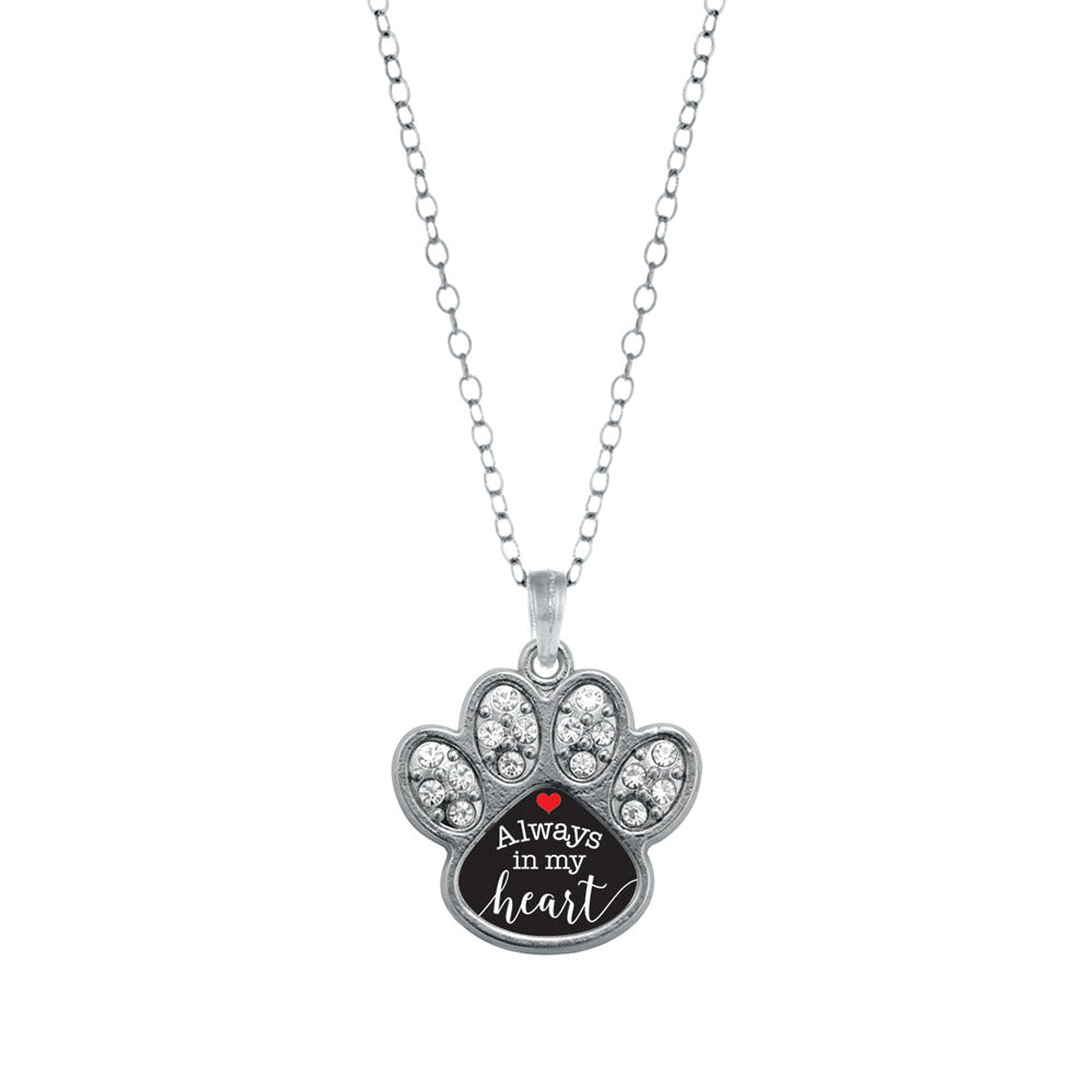 Our sparkling classic necklace, equipped with a stylish lobster claw clasp and the Always in my Heart pave paw charm, is crafted from white metal with a silver plated finish and accented with cubic zirconia stones.