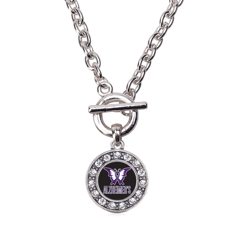 Our sparkling toggle necklace, equipped with a stylish toggle clasp and the Alzheimers Awareness circle charm, is crafted from white metal with a silver plated finish and accented with cubic zirconia stones.