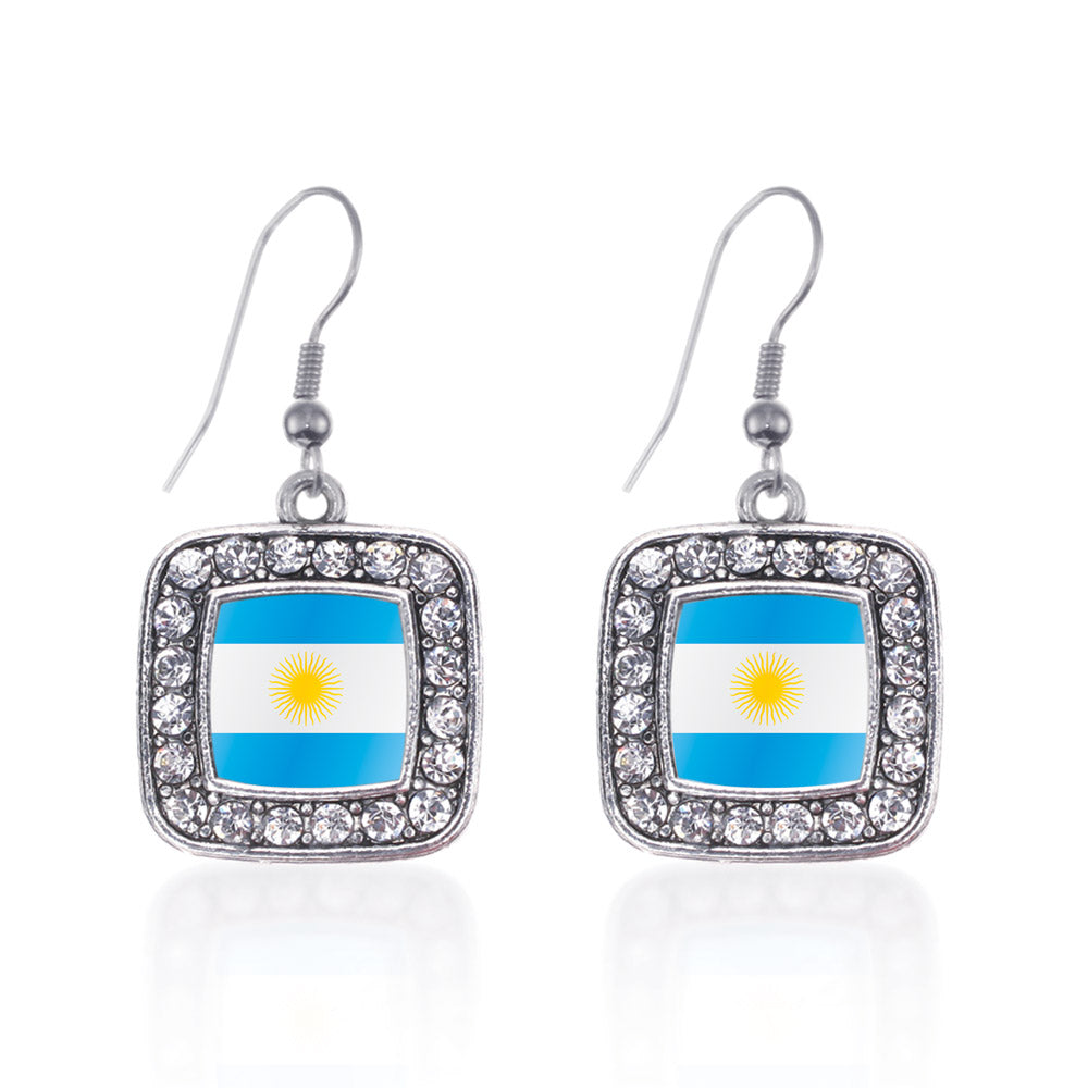 Our sparkling dangle earrings, equipped with a stylish french hook backing and the Argentina Flag square charm, is crafted from white metal with a silver plated finish and accented with cubic zirconia stones.