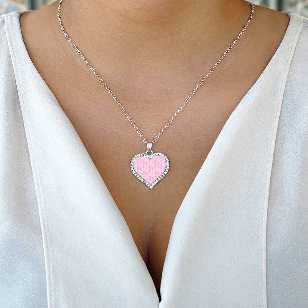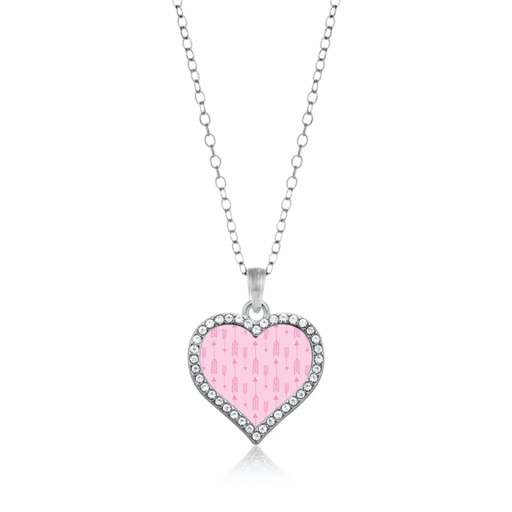 Our sparkling classic necklace, equipped with a stylish lobster claw clasp and the Arrow Pattern Pink open heart charm, is crafted from white metal with a silver plated finish and accented with cubic zirconia stones.