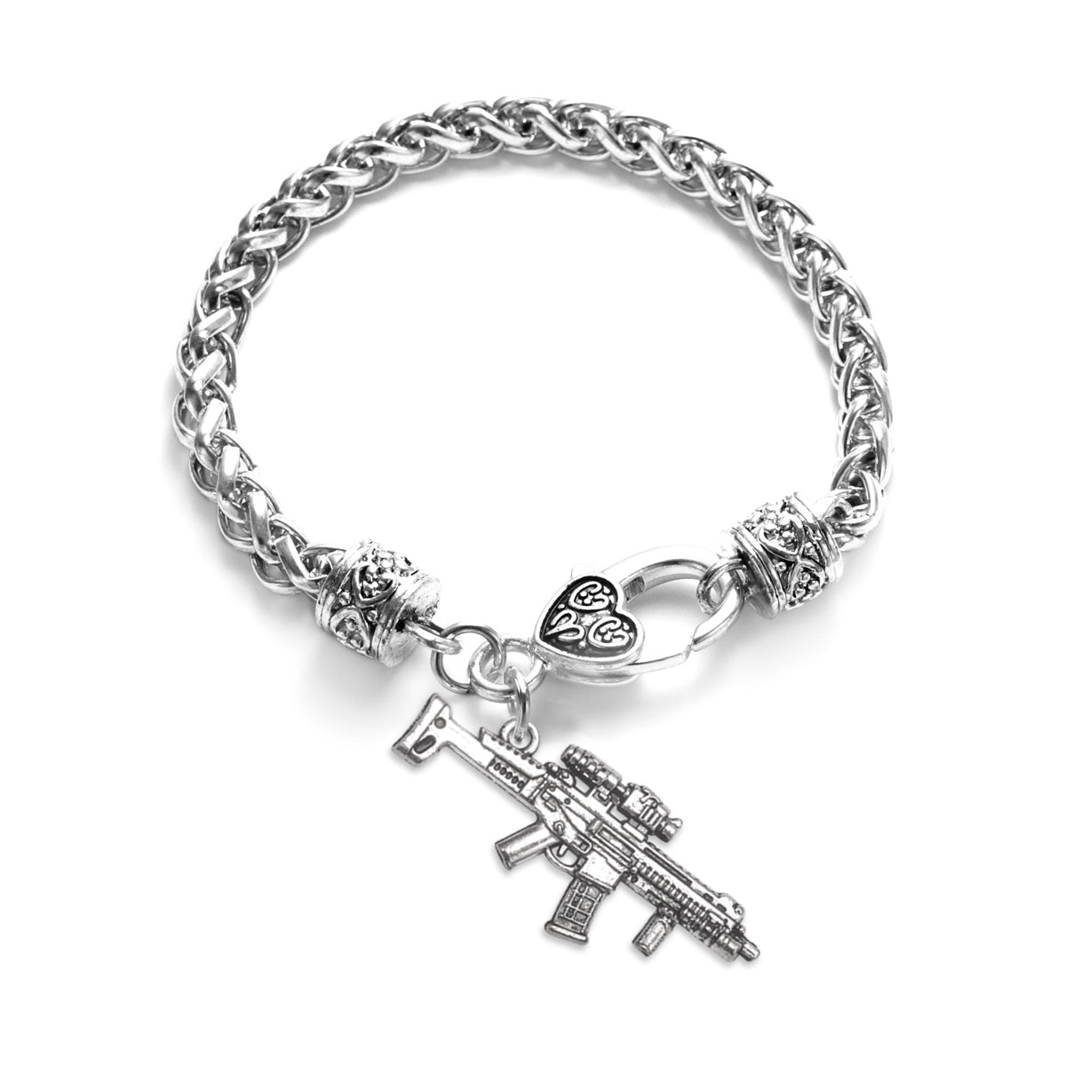Our sparkling braided bracelet, equipped with a stylish lobster claw clasp and the Assault Rifle charm, is crafted from white metal with a silver plated finish.