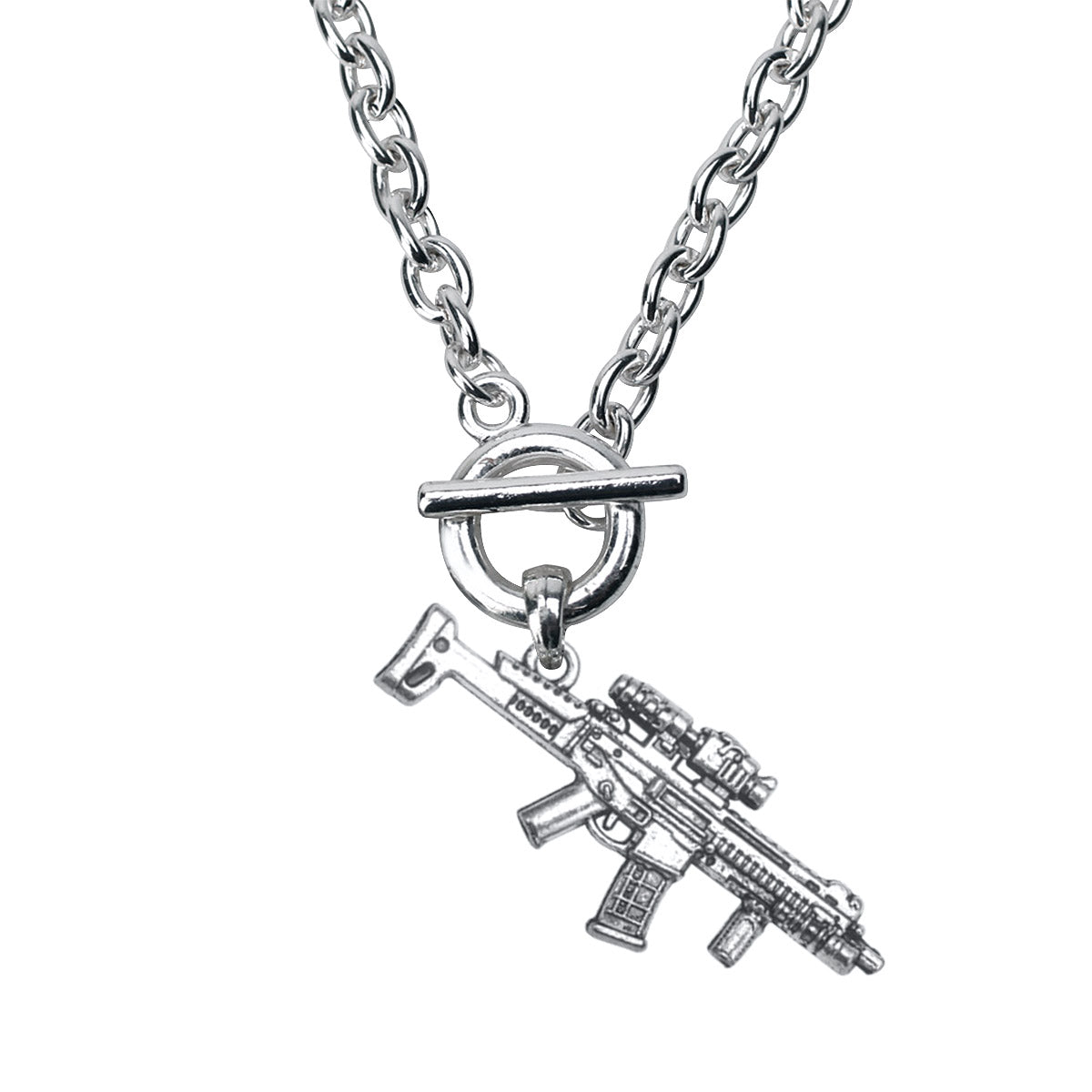 Our sparkling toggle necklace, equipped with a stylish toggle clasp and the Assault Rifle charm, is crafted from white metal with a silver plated finish.