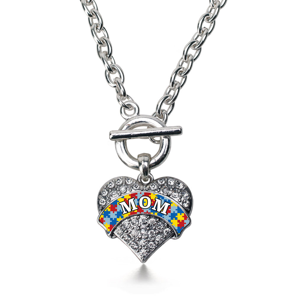 Silver Autism Mom Pave Heart Charm Toggle Necklace