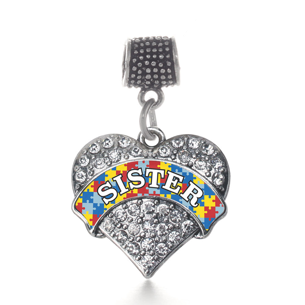 Our sparkling memory charm, equipped with a stylish charm attachment ring and the Autism Sister pave heart charm, is crafted from white metal with a silver plated finish and accented with cubic zirconia stones.