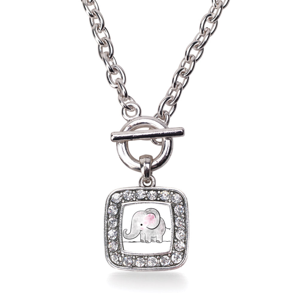 Our sparkling toggle necklace, equipped with a stylish toggle clasp and the Baby Elephant square charm, is crafted from white metal with a silver plated finish and accented with cubic zirconia stones.